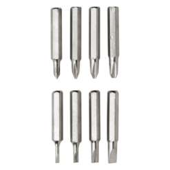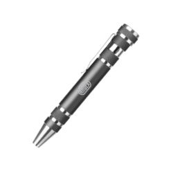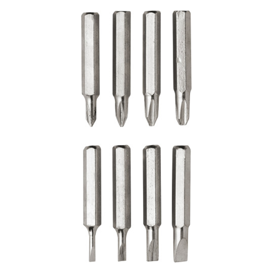 Skruvmejselset av metall i form av en penna. 4 spårbits och 4 stjärnbits (philipsbits) totalt 8 bits.